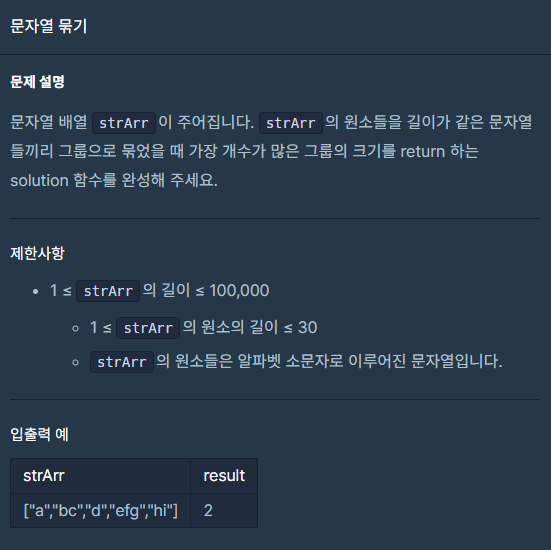 문자열 배열 strArr가 주어질 때 길이가 같은 문자열들을 그룹으로 묶고, 그 중 가장 갯수가 많은 그룹의 크기를 찾아 반환
