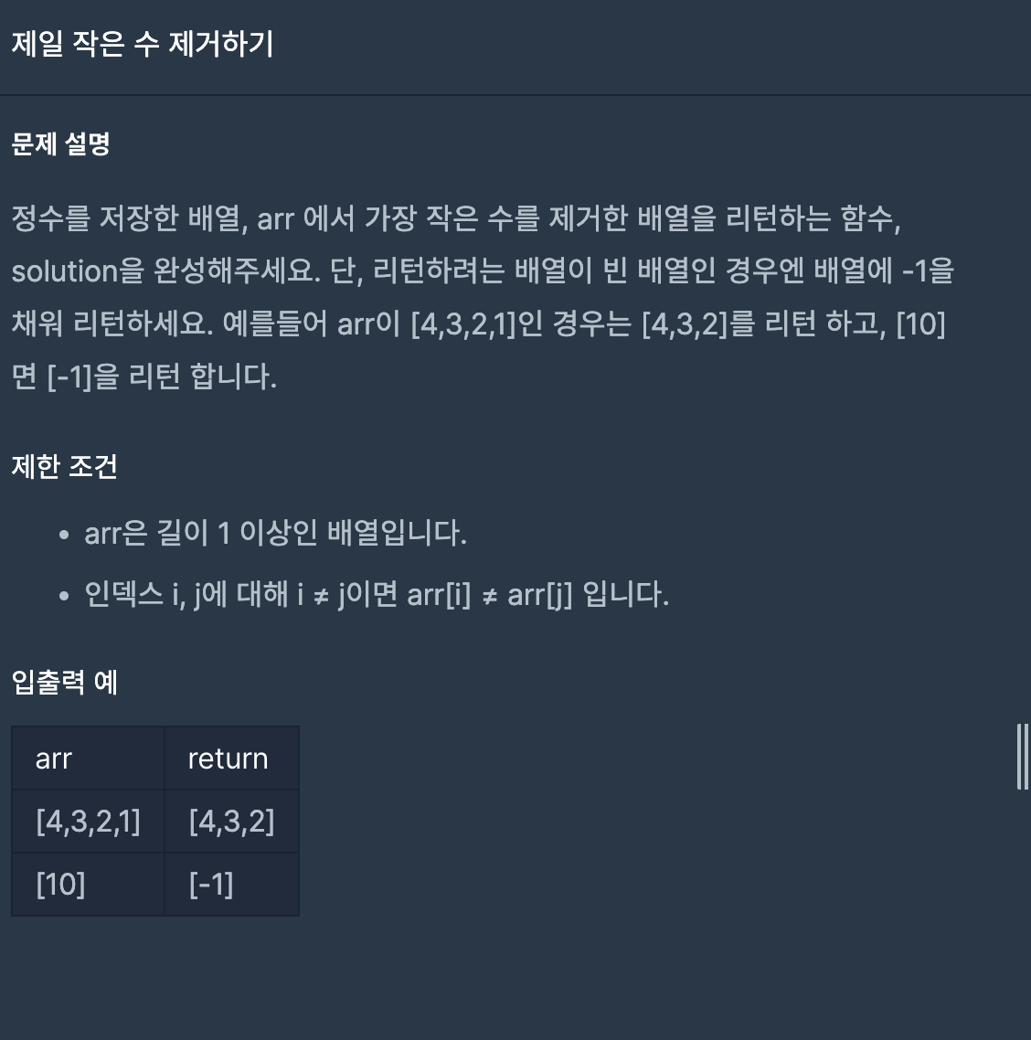 정수를 저장한 배열 arr에서 가장 작은 수를 제거한 배열을 리턴하는 함수, 배열이 빈 배열인 경우 배열에 -1을 채워 리턴하여라