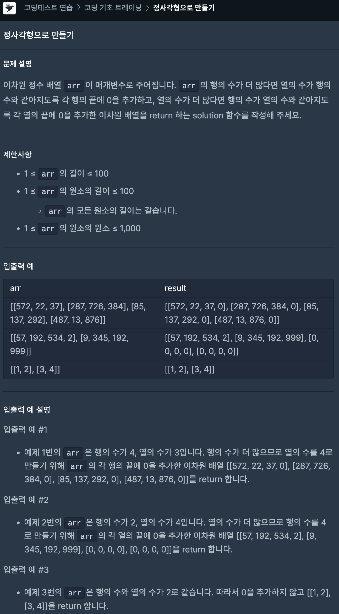 이차원 배열 arr의 행과 열의 개수를 비교하여 행과 열의 수를 일치시켜 정사각형이 될 수 있게 각 위치에 0을 추가한 이차원 배열을 리턴하여라