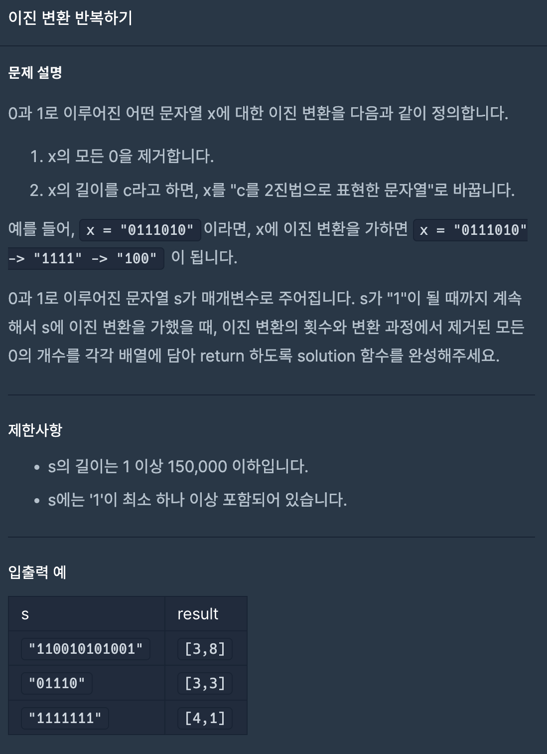 0과 1로 이루어진 어떤 무자열 x에 대한 이진 변환을 계속 실행한다 x의 모든 0을 제거하고 제거한 길이 값을 2진법으로 계속 표시해 1이 될 때까지 계속 변환할 때 이진 변환의 횟수와 변환 과정에서 제거된 모든 0의 개수를 배열에 담아 리턴하여라