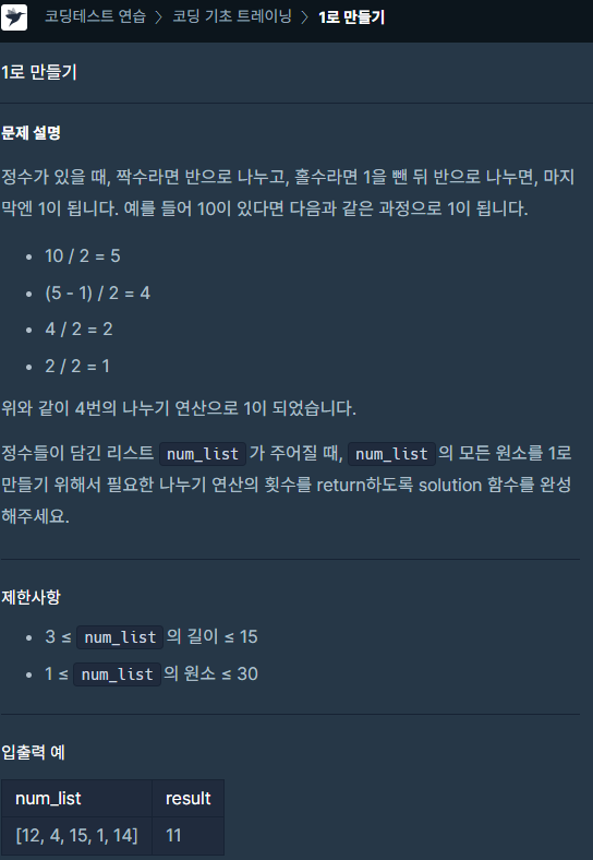 num_list 정수 배열이 주어지고 안의 정수가 짝수라면 반으로 나누고 홀수라면 1을 뺀 후 반으로 나눈다 1이 될 때까지 연산횟수를 리턴
